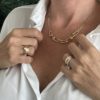 Stefani Double-Tri Necklace is made of 18K Gold. This elegant and modern design combines three gold colors, yellow, white and rose. The two layers chain is decorated with beautiful double and triple round links. The combination of triple links made of three different gold colors gives a unique and sophisticated style